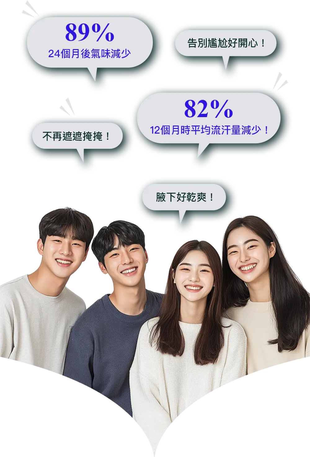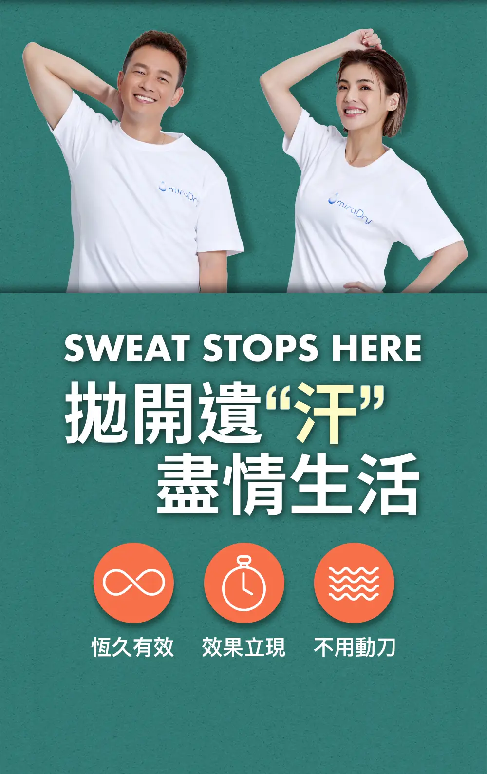 您可以期待立即且持久效果。一旦汗水、異味及毛髪被miraDry消除,他們就永久消失了。臨床研究顯示平均可減少82%的出汗情況。與任何醫美療程相同,客戶效果及感受可能因人而異。